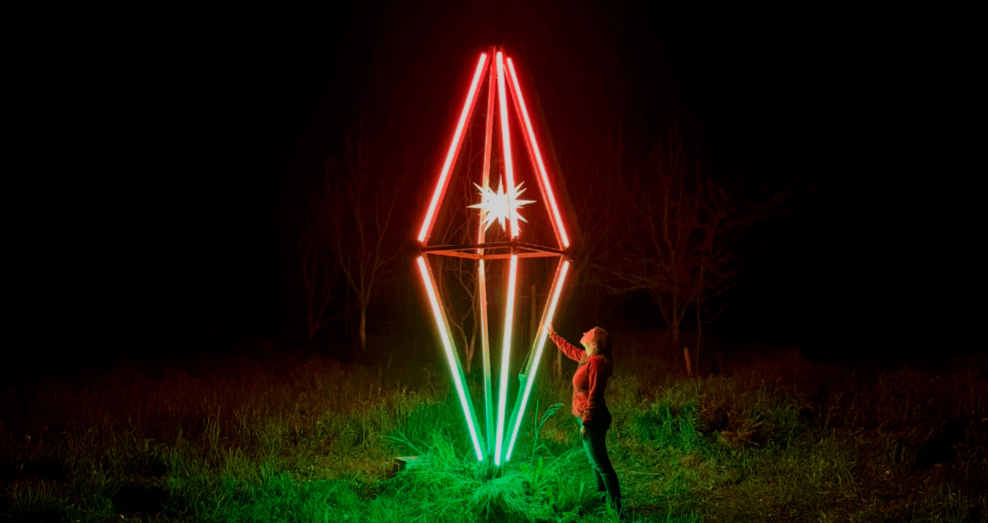 “Crystalis” parteix de la forma del rombe tridimensional, inspirada en el creixement ordenat dels cristalls i la seva connexió amb la geometria sagrada. La instal·lació explora la relació entre llum, matèria i forma, utilitzant els rombes com a prismes que projecten colors i animacions. El resultat és un diàleg lumínic que evoca el moment en què l’energia es materialitza i la geometria revela l’ordre intern de la natura.