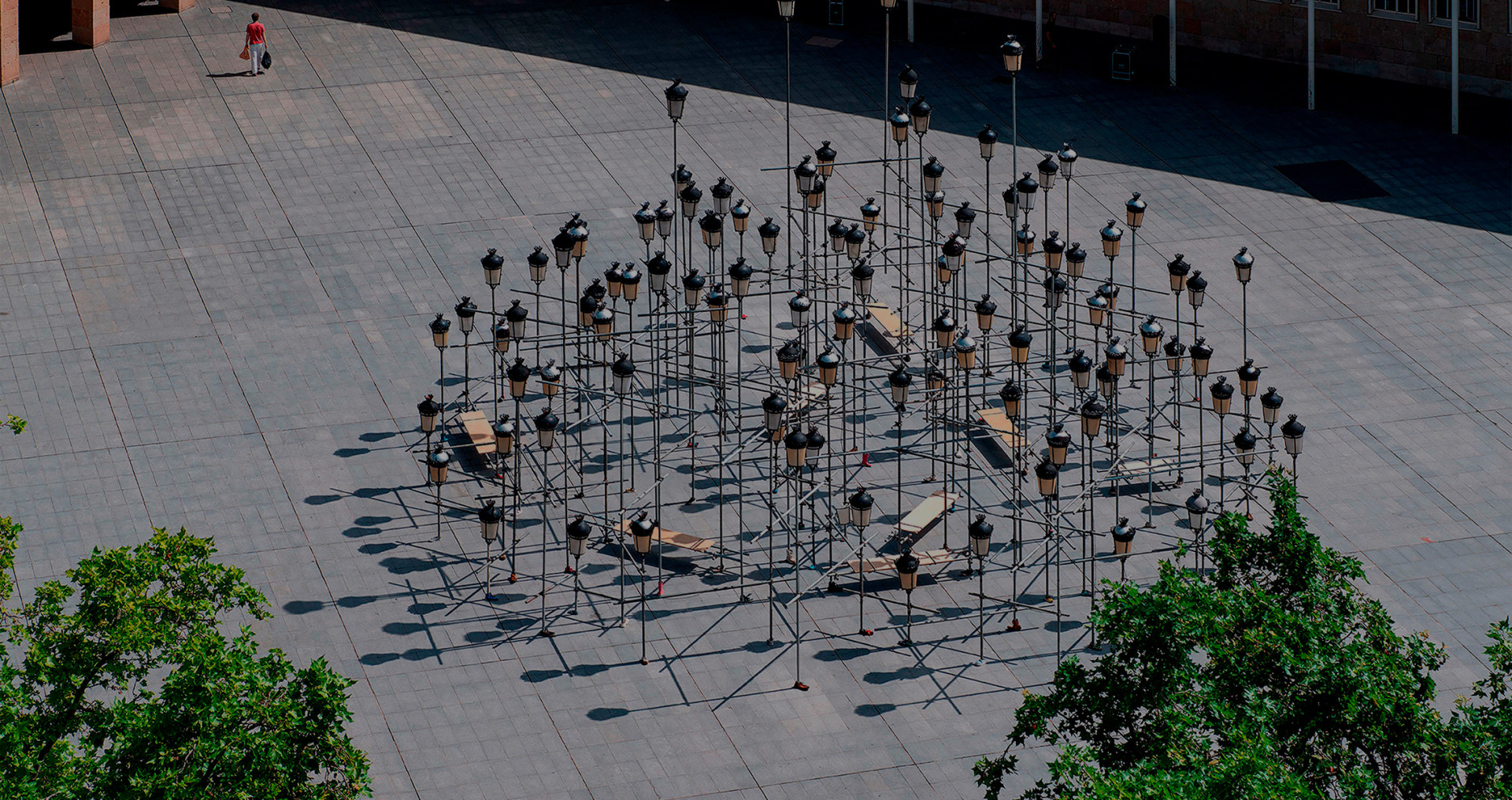 Una peça que interpel·la l’espai públic, una urbanitat condensada mitjançant elements urbans que configuren una intervenció escultòrica: una fita vertical de 18 m de diàmetre. La peça dibuixa el paisatge traçant línies amb una estructura tectònica generada per addició i repetició. A manera de núvol, es construeix mitjançant les simples i conegudes barres tubulars, amb les seves unions, que serveixen per aixecar les bastides de les ciutats. Les faroles es domestiquen i ofereixen altres punts de vista, des dels deu metres d'alçada fins a una relació gairebé directa amb el terra. L'estructura pauta i acota l'espai, mentre que al sòl, 111 xancletes protegeixen cada pilar, aportant caràcter i donant un toc d’humor. La llum no només il·lumina, sinó que embolcalla i permet endinsar-nos entre els punts lluminosos i formar part de l’atmosfera. La instal·lació esdevé un paisatge conegut i alhora vivencial. És una experiència on seure, perdre’s i recórrer la ciutat entre les 111 faroles. Amb la col·laboració de l’Aquàtic Club Xaloc.