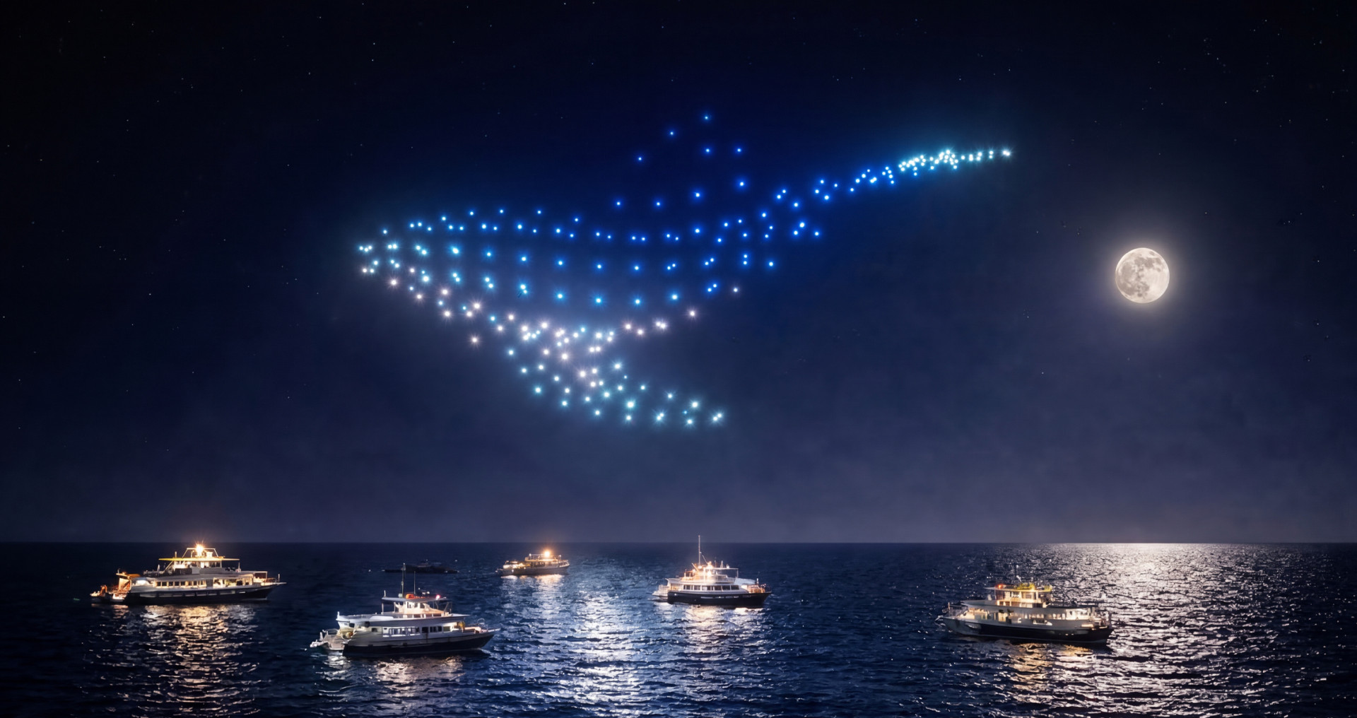 Sant Feliu mira al mar. Respira mar. Viu del mar. El cel es transforma en un llenç viu on la llum dibuixa onades en moviment, coralls que floreixen, bancs de peixos que dansen i embarcacions que emergeixen de l'horitzó, entrellaçades amb els símbols propis de la ciutat. Una experiència poètica que connecta amb la seva història, el seu paisatge i el seu orgull mariner. A través dels 200 drons de Flock Drone Art, el cel batega amb l'aigua en una ciutat que es reflecteix en la llum.