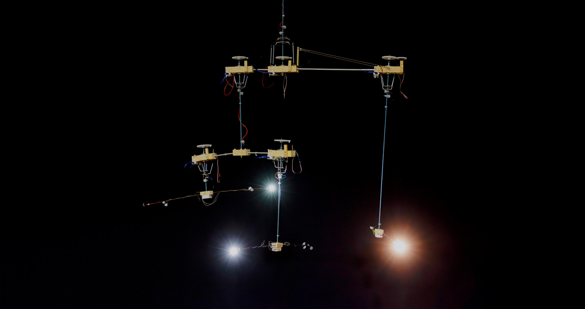 Sistema mòbil amb juntes elèctriques que distribueixen l’energia fins als seus extrems. Quan el contemplem des de sota (escenari), en ple moviment, l’efecte és captivador. Els punts de llum avancen amb una lentitud hipnòtica, dibuixant el·lipses que es creuen i es transformen, evocant l’univers silenciós d’un cel estrellat i la dansa precisa dels satèl·lits. Contemplada des de la platea, la vista frontal ens ofereix una perspectiva totalment diferent de la instal·lació, recordant-nos les balises que al llarg de la costa indiquen el camí als navegants. La peça completa, formada per 8 d’aquests mòbils, convida a deixar-se portar per la poesia del moviment i de la llum.
